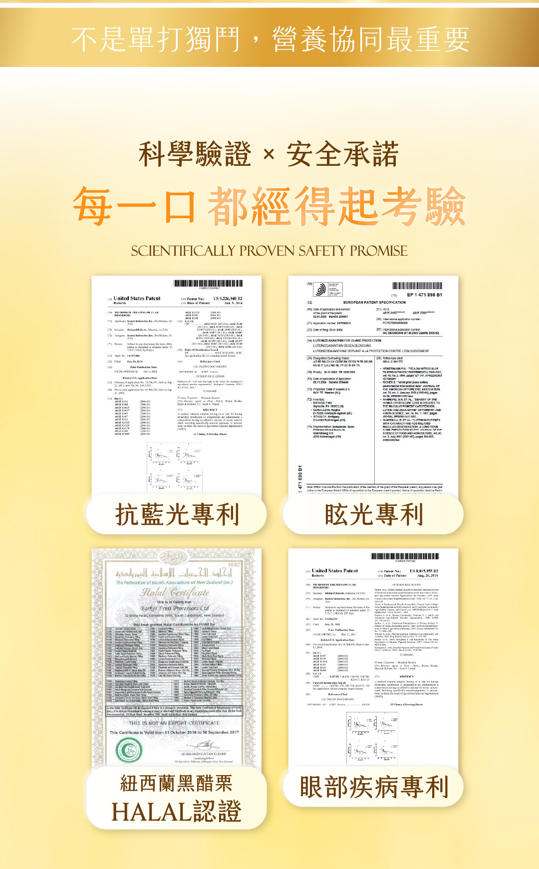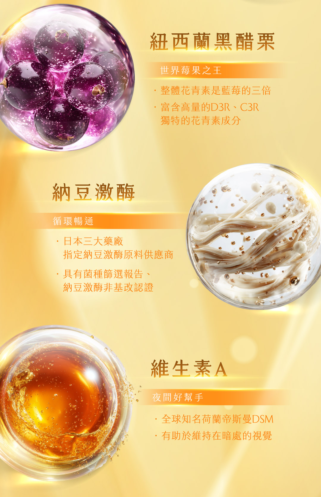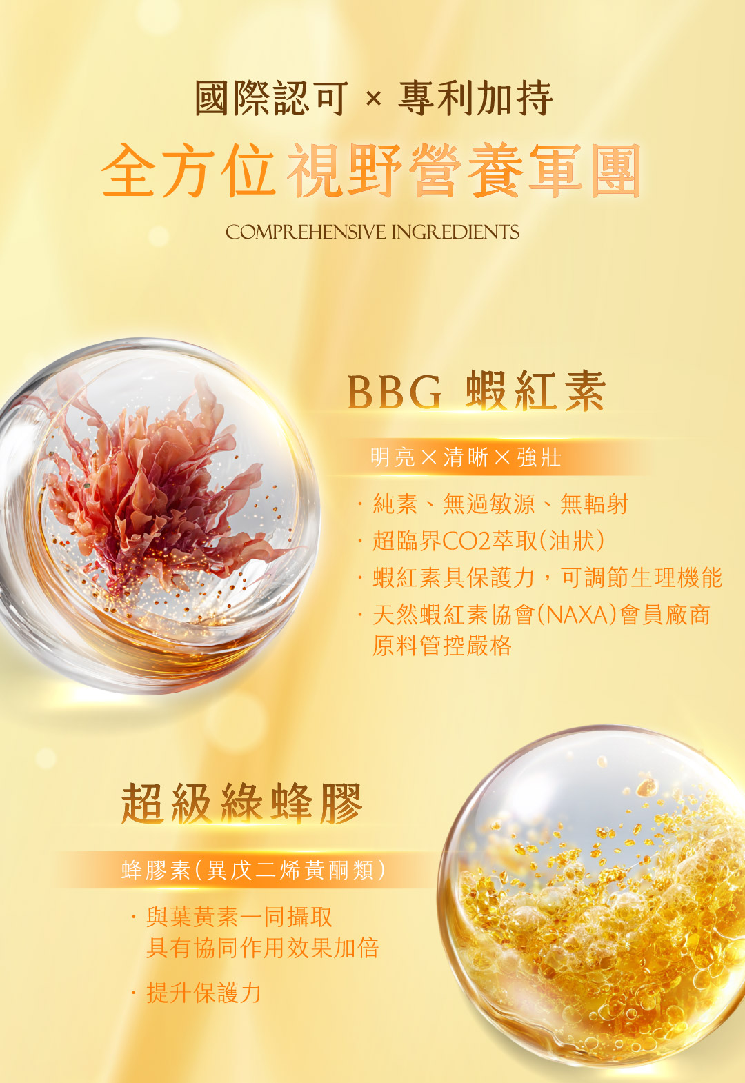 主成分:游離型葉黃素、特選玉米黃素、專利蝦紅素、超級綠蜂膠、紐西蘭黑醋栗、納豆激酶、維生素A